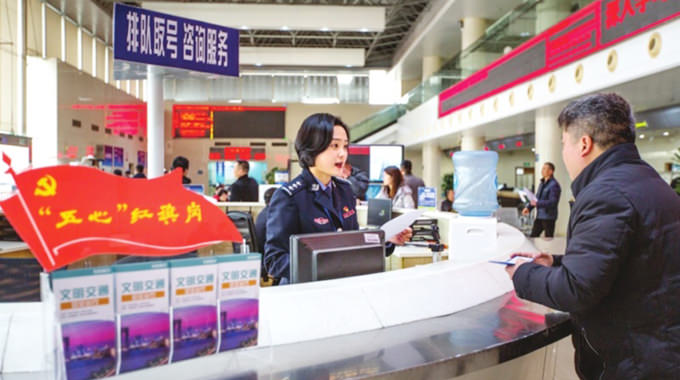 车管所内由党员带头服务,将原先分散在办证大厅、检测线、号牌制作点等处的窗口整合成一条“红色流水线”。车管所办证大厅咨询服务台党员民警翟云每天面对数以千计办事群众,她摸索提炼出“五心”工作法,用热心、诚心、细心、公心、恒心,让每一位群众都能享受到高品质的车驾管服务。